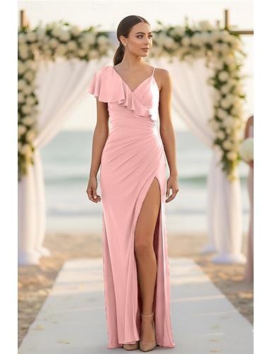 גזרת A עד הריצפה שמלות נשף אלגנטית ללא שרוולים כתפיה אחת רשמי אורחת חתונה למתוח שיפון עם קפלים שסע