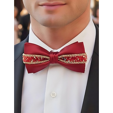 פפיון חג המולד לגברים - פפיון סאטן אדום, שחור ולבן עם קריסטל ושרשרת זהב - אביזר חגיגי אלגנטי לאירועים רשמיים