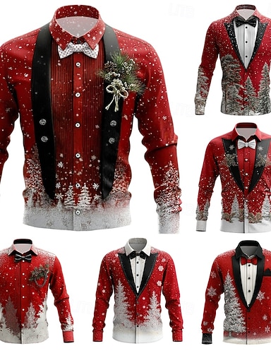 חג המולד בגדי ריקוד גברים תחפושת חג המולד חולצת טוקסידו מודפסת עם עניבת חליפה חולצה חולצה עם כפתורים שרוול ארוך מצחיק בָּחוּץ חגים אביב סתיו צווארון מתקפל הדפסת תלת מימד חולצות צווארון אדום 1 אודם
