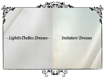 1. Fabric LightInTheBox.com uses 395 Taiwan Satin, which is very soft, doesn't wrinkle easily, is easy to iron and wash and has a natural glossy shine. It is also heavier than other types of satin with an extra 30-35 g/m2. The individuals who are stealing our product images use satin that is only 120-125 g/m2, which is lower in quality, has an underwhelming gloss, is uncomfortable to touch and becomes wrinkled easily. |