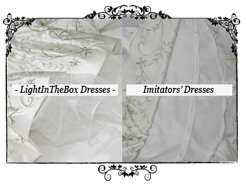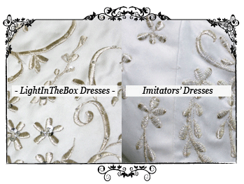2. Embroidery LightInTheBox.com's embroidery techniques are extremely detailed, look vivid and are very solid and compact. The copied dresses' embroidery is poor because of its unimpressive technique and easily comes loose. |