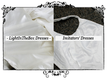4. Inside Lining At LighInTheBox.com we use a hard net lining to make our dresses, so even if you don't wear a petticoat, the dress will still look great. We also uses a comfortable lining clothe that feels nice to the touch. The Lightinthebox.com dress copiers only use very poor clothe for the lining that has no style and counts bad stitching among its many problems. |