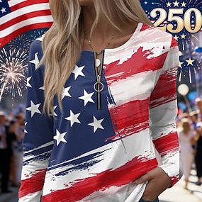 Függetlenség Napja Amerikai Évforduló Patriotikus Női Póló Grafika Zászló Vintage Divat Stílusos Hosszú Ujjú Kerek Nyakú Rendszeres Felsők Napi Cipzár Nyomtatás Kék Fehér Piros Nyár Tavasz