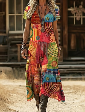 Női Maxiruha Boho ruha hétköznapi ruha Nyomtatott ruha Elegáns Divat Modern Szabadtéri Vakáció Alkalmi Laza öltözet Mértani Rövid ujjú V-alakú Fehér Rubin Khakizöld Nyár Tavasz