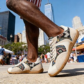 férfi vászon casual tornacipő – könnyű nyári cipő bojtos díszítéssel, bohém etnikai mintával, bebújós kialakítással, ideális tengerparti nyaraláshoz, utazáshoz és mindennapi szabadidőhöz