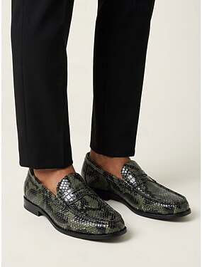 Férfi zöld és barna kígyómintás bőr mokaszinok, bebújós divatos cipők éjszakai klubokba, partikra, merész divatnyilatkozatokra és esküvőkre