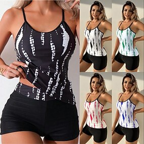 Női Tankini 2 részes fürdőruha rövidnadrág hasformáló magas derekú karcsú háton nyitott vakációs strandruha csíkos U nyakú ujjatlan fürdőruhák