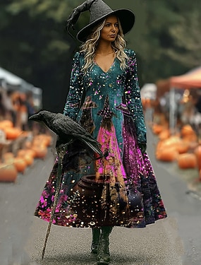 Női Koponya Nyomtatott Maxi Ruha Shift Ruha A vonalú Ruha Kényelmes Napi Normál Fit Grafikai Bika Hosszú Ujjú Kerek Nyakú Fekete Lila Ősz Tél