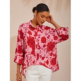 Női Póló Nyomtatott Virágos Stílusos Klasszikus Alkalmi Rövid ujjú Hosszú ujj Terített nyak Normál felsők Napi Medence Fekete Fehér Arcpír rózsaszín Bíbor Nyár Tavasz Ősz