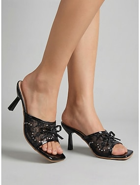 női elegáns fekete hálós, magassarkú papucs - szexi, szögletes orrú szandál strasszos masnival nyári vakációra, koktélpartikra &mindennapi sikkes ruhák
