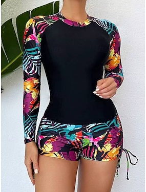 Női Tankini 2 Részes Fürdőruha Ráncos Pálma Rövidnadrág Hasformáló Magas Derék Slim Hátsó nélkülözött Nyaralás Strandruha Virágos Levél Kerek Nyak Hosszú Ujjú Fürdőruhák