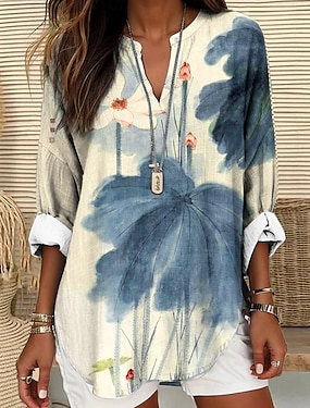 Női Blúz Vászon Szerű Lélegző Könnyű Tunika V Nyakú Hosszú Ujjú Boho Hétköznapi Virágos Grafikus Vintage Trópusi Normál Felsők Napi Vakációs Ruházat Nyomtatás Fekete Kék Khaki