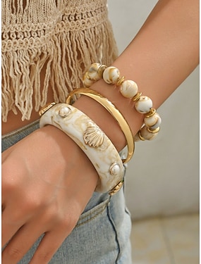 női akrilötvözet karkötő szett, többszínű divatos karperec és gyöngyös, egymásra rakható ékszerek, hétköznapi bohém üdülő stílusú csuklókiegészítők nyaraláshoz, tengerparti utazáshoz, mindennapi viselethez és szabadidős alkalmakra