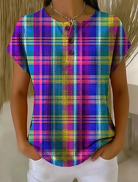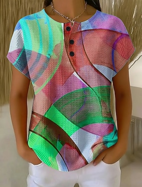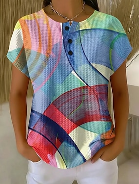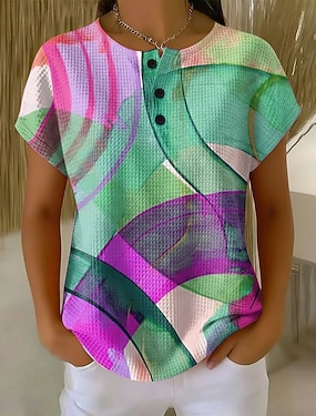 Női Póló Nyomtatott Mellkasi gombok Mértani Stílusos Modern Alkalmi Rövid ujjú Henley Normál felsők Napi Medence Rubin Bíbor Lóhere Nyár Tavasz