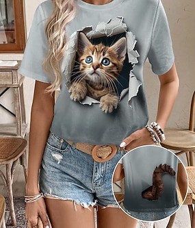 Női póló - Cuki kiscica kukucskáló grafika kerek nyakú rövid ujjú laza mindennapi viselet puha kényelmes egyedi mintás kék normál és plusz méret
