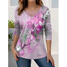 Húsvéti Női 3D Nyomtatású Póló Virágos Grafika Növények Vintage Stílusos Hétköznapi Hosszú Ujjú V Nyakú Szokásos Felsők Mindennapi Sárga Rózsaszín Piros Lila Nyár Tavasz Ősz