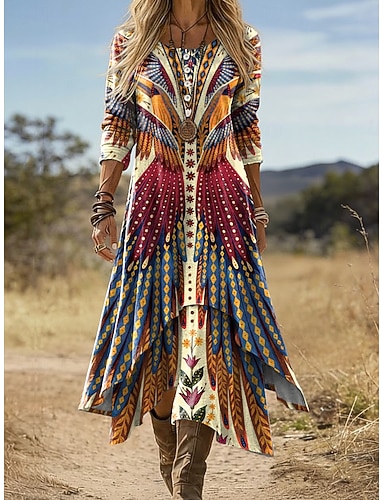 Női Midi Ruha Boho Shift Ruha Vakáció Parti Causal Napi Ünnepi Normál Fit Grafikus Geometrikus Hosszú Ujjú Kerek Nyakú V Nyakú Kék Sárga Lila Zöld Nyár Tavasz Ősz
