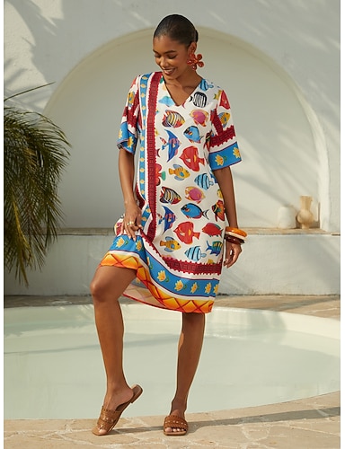 Nő Térdig érő ruha Rubin Rövid ujjú Féhosszú Absztrakt Állatminta Virágos Nyár Tavasz Tavaszi nyár V-alakú Mély-V Szabadság Nyilatkozat Bohém S M L