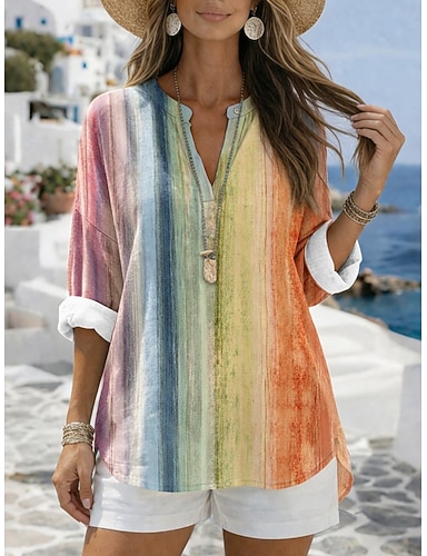 Női Blúz Művászon ing Gombok Tömör szín Napi Alkalmi Háromnegyedes V-alakú Hosszú felsők Napi Tengerpart Fekete Fehér Rubin Narancssárga Lóhere Nyár Tavasz Ősz