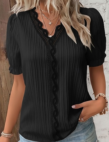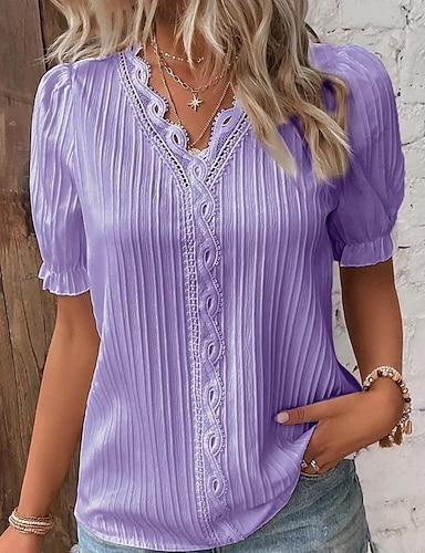 Női Ing Blúz Tee Top Kollázs Gombok Sima Elegáns Szabadság Szüret Rövid ujjú V-alakú Normál felsők Napi Szabadság Alkalmi Medence Fekete Arcpír rózsaszín Narancssárga Lóhere Nyár Tavasz