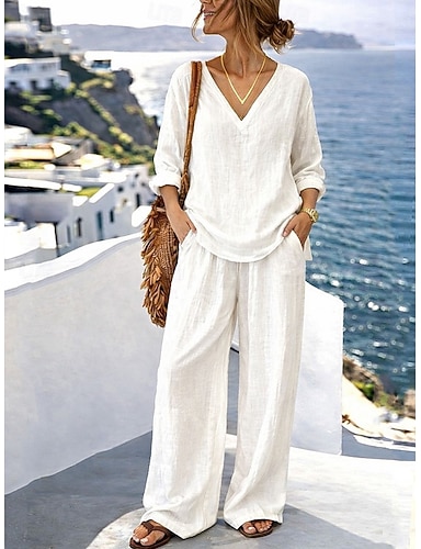 Női Pamut ágynemű készletek Nadrág szettek Hosszú ujj V-alakú Tömör szín Divat Utcai sikk Hétköznapi Napi Szabadtéri Medence Fehér Barna Nyár Laza öltözet