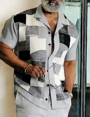 Férfi Mértani Színes Ing Gombos póló Tábori póló Rövid ujjú Alkalmi divat Utcai öltözék Vakáció Nyár Tavasz Kubai nyakörv 3D nyomtatás Medence Lóhere Khakizöld Szürke
