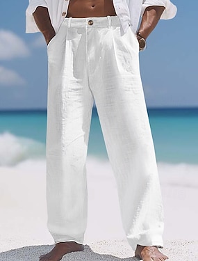 Férfi Vászon nadrág Nadrág Nyári nadrág Bő nadrág Rugalmas derék Redők Egyenes lábbal Sima Mokaszinok Légáteresztő Teljes hossz Szabadtéri Napi Szabadság Szabadság Divat Fekete Fehér Nem elasztikus