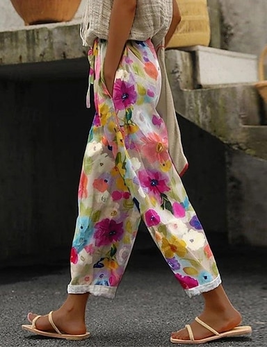 női pamut vászon nadrág laza nadrág vászni like tengerparti rövidnadrág vakáció vintage divat boka hossza magas derék virágos grafikai levélnyomás lélegző puha mikroelasztikus szabadtéri vakáció laza
