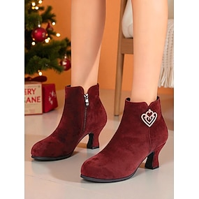 Női bordó velúr bokacsizma szív alakú díszítéssel és oldalsó cipzárral, elegáns és ünnepi stílus, tökéletes karácsonyra, ünnepi partikra és téli rendezvényekre