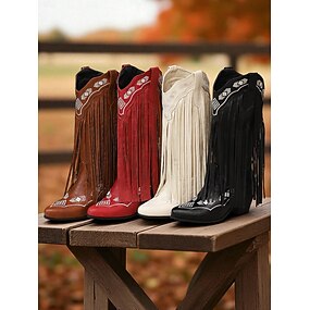 női western rojtos cowboy csizma – barna műbőr térdig érő csizma hímzett részletekkel, retró vidéki stílus rodeóhoz, őszi fesztiválokhoz és farmdivathoz