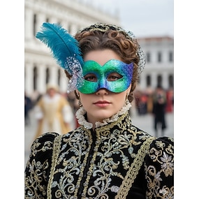 Női kék-zöld fényes tollas álarc a Mardi Gras-ra – Elegáns velencei karneváli jelmez kiegészítő textúrált mintával bulikhoz és bálokhoz