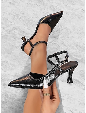 hegyes orrú, slingback női sarkú cipők – elegáns lakkbőr pumpák cicasarokkal, keresztpántos kivitel irodai, parti- és ünnepi viselethez