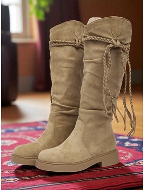 női térdig érő csizma, kerek orrú, alacsony sarkú, divatos, hosszú szárú csizma, városi, lezser stílus, utcai és mindennapi viseletre