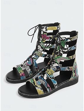 női kígyómintás gladiátor szandál – fűzős, pántos, lapos talpú cipő, merész bohém stílus kültéri nyaraláshoz, utazáshoz, strandra és nyári fesztiválokra