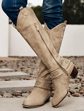 női western csizma perforált csatos pánttal és varrásrészlettel, középvádárig érő cowgirl csizma hétköznapi és kültéri viseletre