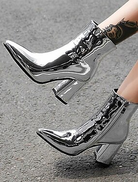 női ezüstmetálfényű bokacsizma műszőrme béléssel, hegyes orrú és tömb sarokkal, meleg, divatos rövid csizma őszi-téli bulikra és esti kiruccanásokra