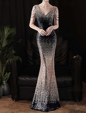 Hableány Trumpet Flitteres Báliruha Ombre Parti Ruha Formális Koktél Parti Vízszintes Hosszú Ujjú V Nyak Gyöngyökkel Flitteres