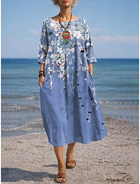Női Midi ruha Nyári ruha A vonalú ruha Szabadság Alkalmi Boho Tengerpart Parti Szabadság Laza öltözet Virágos Grafika Hosszú ujj V-alakú Hamvaszöld Poros kék Barna Nyár Tavasz Ősz
