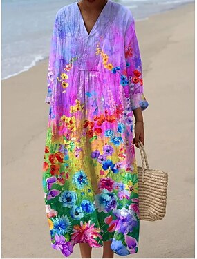 Női Maxiruha Váltó ruha Alkalmi Napi Alkalmi Laza öltözet Virágos Grafika Hosszú ujj V-alakú Sötétrózsaszín Bíbor Narancssárga Bézs Nyár Tavasz