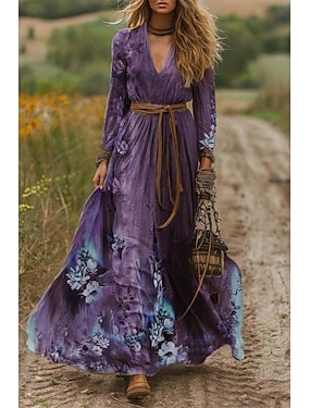 Női Midi ruha Boho ruha hétköznapi ruha Divat Napi Szabadtéri Vakáció Normál Virágos Hosszú ujj V-alakú Bíbor Nyár Tavasz Ősz