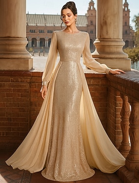 A-vonalú földhosszan viselhető esküvői vendégruha formális ruhák estélyi az ifjú ara anyja ruhája hosszú ujjú kerek nyakú elegáns vintage csillogó és ragyogó spandex flitterekkel