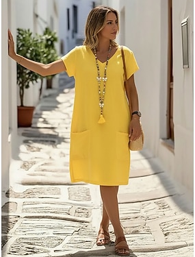Női Térdig érő ruha Műpamut ágynemű Pamut vászon ruha Elegáns Divat Modern Napi Szabadtéri Vakáció Laza öltözet Sima Rövid ujjú V-alakú Sárga Arcpír rózsaszín Bor Katonai zöld Nyár Tavasz