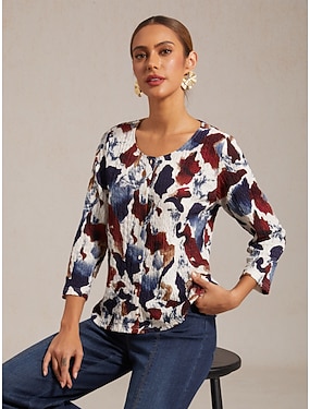 rugalmas, kerek nyakú, ecsetmintás vakációs blúz