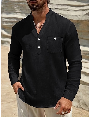 Férfi Ing Vászon ing Viking stílus Nyári póló Strandruházat Tömör szín Vakáció Utca Fekete Fehér Sötétkék Medence Hosszú ujj Henley Nyár Tavasz Ruházat Zseb