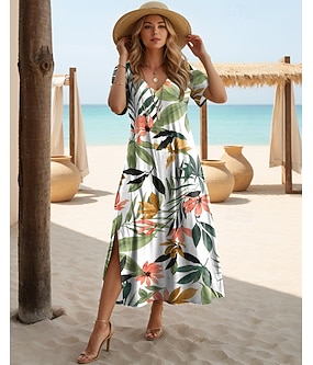 Női Midi ruha A vonalú ruha nyári ruha Szabadság Alkalmi Tengerpart Normál Virágos Grafika Rövid ujjú V-alakú Világosbarna Lóhere Nyár Tavasz
