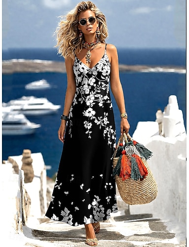 Női Maxiruha Nyári ruha A vonalú ruha Slip ruha Szabadság Alkalmi Boho Tengerpart Normál Virágos Grafika Ujjatlan V-alakú Fekete Nyár Tavasz