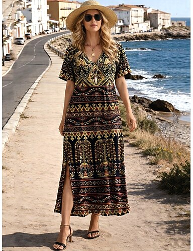Női Maxiruha Váltó ruha Nyári ruha Pólóruha Szabadság Alkalmi Boho Tengerpart Parti Normál Grafika Etno Rövid ujjú V-alakú sötétbarna Nyár Tavasz
