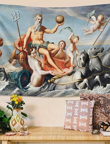Neptunusz Poszeidón görög isten mitológia szekér fali kárpit vintage barokk tengeri nimfák olajfestmény esztétikus nagyméretű szövet függő nappaliba hálószoba kollégiumi lakberendezés