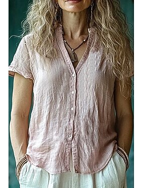 Női Ing Pamuk Blend Begombol Blúz Gombok Sima Alap Alkalmi Rövid ujjú V-alakú Normál felsők Szabadság Alkalmi Piros rózsaszín Világoszöld Világoskék Nyár