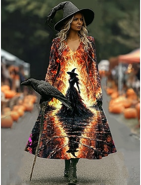 Halloween Női Boszorkány Nyomás Midi Ruha A-vonalú Ruha Vakáció Hétköznapi Napi Normál Illeszkedés Virágos Grafikával Hocus Pocus Hosszú Ujjú V Nyakú Fekete Piros Barna Tavasz Ősz